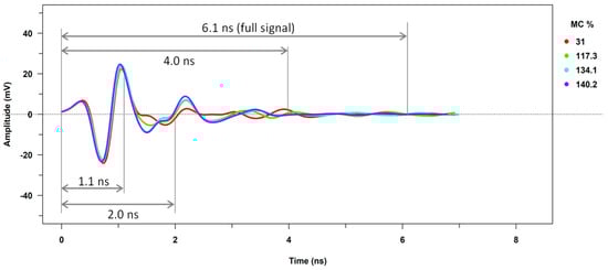 The majority (95%) of the GPR scans produced around 500 traces depending on the duration of each individual scan. Direct current (DC) shift was removed from each trace by subtracting the average of the first 25 amplitude values from each data point in the trace. The arrival time of the direct wavelet of each trace was selected based on a 14% maximum amplitude threshold value []. Time zero correction was then applied to each trace according to the selected arrival times so that the traces had the consistent pulse onset times. After pre-processing, the traces contained 228 time-sampling points, which was equivalent to a 6.1 ns signal time window. This signal will be referred to as the full trace/signal hereafter (Figure 3). All traces within each scan were averaged, resulting in a total of 3810 averaged traces (one average trace representing a scan in this case). The four traces from the four scanning positions were further averaged for each log at each drying stage, resulting in 953 traces in total (Table 2). These traces served as the base GPR signal matrix for estimating log MCs from the GPR signals (with observations as rows and time samples as columns). Signal preprocessing was carried out using the RGPR package of the R statistical computing software []. Figure 3 presents an example of pre-processed GPR signals collected at four MC levels from the same log.
