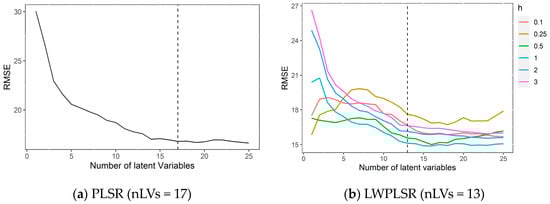 In this paper, both PLSR and LWPLSR models were fitted on the same datasets. The hyper-parameters of the models were tuned with a five-fold cross-validation. The goal of this tuning for the PLSR models was to find the optimal number of latent variables (nLVs) (Figure 4a). For the LWPLSR models, two hyper-parameters were tuned: nLVs and the shape of the weight function, h (Figure 4b). A lower h value implies a sharper weight function []. The optimal hyper-parameters were selected based on a single criterion of having the lowest nLVs while RMSE is not greater than the sum of the lowest RMSE and an allowance. The allowance was set at 0.25 for models predicting MCs and 0.0125 for models predicting log diameter and bark thickness. Figure 4 illustrates this process in the case of the log MC model based on the four drying stages and four mixed species.