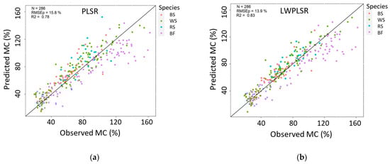Observed vs. predicted log MC from full GPR signals (6.1 ns). (a) partial least squares regression (PLSR) model; and (b) locally weighted PLSR (LWPLSR) model. The models were fitted on a calibration set containing black spruce (BS), white spruce (WS), red spruce (RS), and balsam fir (BF) and four drying stages (n = 660). Shown are observed and predicted values on the validation set (n = 286).