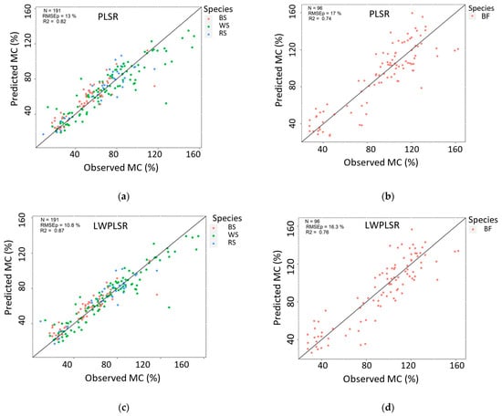 Observed vs. predicted log MC using full GPR signals (6.1 ns) for partial least squares regression (PLSR) and locally weighted PLSR (LWPLSR) models. (a) PLSR model fitted on a calibration set containing black (BS), white (WS), and red spruce (RS) (n = 443); (b) PLSR model fitted on a calibration set containing only balsam fir (BF) (n = 221); (c) LWPLSR model fitted on a dataset containing the three spruce species (n = 443); (d) LWPLSR model fitted on a calibration containing only balsam fir (n = 221). Shown are observed and predicted values on the validation sets (n = 191 and 96 for spruces and balsam fir, respectively).