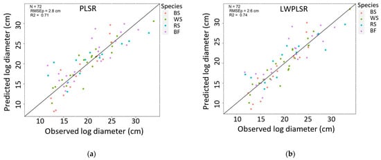 Observed vs. predicted log diameter (Dob) using full GPR signals (6.1 ns). (a) partial least squares regression (PLSR) model; and (b) locally weighted PLSR (LWPLSR) model fitted on a dataset containing all species at green state (n = 164). Shown are observed predicted values on the validation set (n = 72).