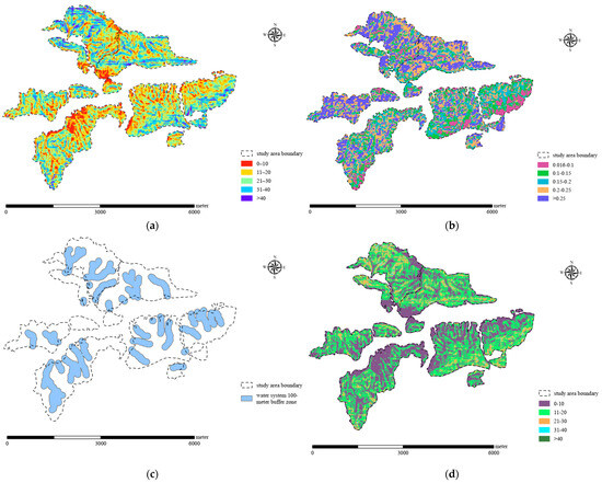 Indicators such as the flow direction, flow rate, confluent river network, and natural watersheds in the study area comprehensively reflect the hydrological conditions in the study area. In this study, the 100 m near the river course was confirmed as an ecological buffer zone. The closer the forest road is to the river area, the stronger the sensitivity and the higher the risk factor. The digital elevation model (DEM) was taken from the Geospatial Data Cloud. This study was based on the DEM data of the study area and used the surface analysis tool of ARCGIS 10.7 to conduct hydrological analysis. After drawing the ecological buffer zone, we used the intersection tool of ARCGIS 10.7 to superimpose the forest road and the ecological buffer zone, and then we calculated the proportion of the forest road length in the buffer area to the total forest road length, where WA represents the length of forest roads that pass through ecologically sensitive areas of waterways, as a proportion of the total length of the forest roads (