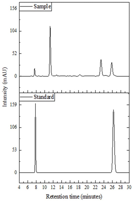 As shown in Figure 1, the retention time in the standard sample was determined to be 8 min and 26.2 min for caffeine and theobromine, respectively.