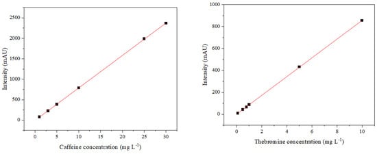 The purity content of these compounds was carried out, obtaining responses of >99%. Linear regression showed a correlation coefficient above 0.9999 for both compounds. The limits of quantification (LOQ) presented values of 0.6115 and 0.1849 mg L−1 for caffeine and theobromine, respectively. The limit of detection (LOD) presented values of 0.2018 and 0.06102 mg L−1 for caffeine and theobromine, respectively. Calibration curves for caffeine and theobromine concentrations are shown in Figure 2.