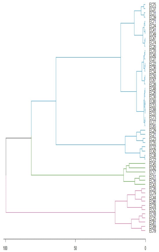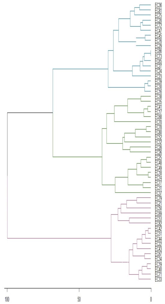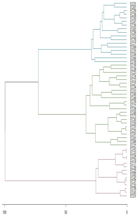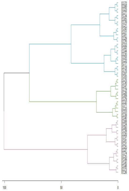 Genotypic stability clustering using Ward’s Minimum Variance Method of genotype–environment ratio of yerba mate genotypes (EC) for caffeine concentration according to PC1 and PC2.
