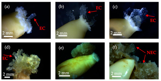 States of embryogenic callus (EC) formation from immature hybrid embryo explants of Korean pine. (a) Morphology of embryogenic callus induction on day 5; (b) morphology of embryogenic callus induction on day 10; (c) morphology of embryogenic callus induction on day 20; (d) morphology of embryogenic callus induction on day 30; (e) degradation of induced callus tissue after formation; (f) morphology of non-embryogenic callus (NEC) tissue.