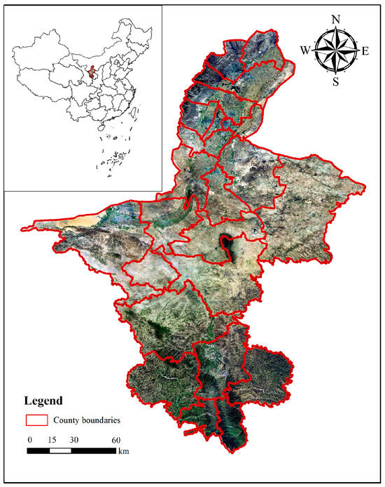 As shown in Figure 1, Ningxia Hui Autonomous Region is situated in the upper reaches of the Yellow River, covering a land area of 6.64 million square kilometers. The region’s topography exhibits elevations that are higher in the south and lower in the north. The northern areas are characterized by developed agriculture and abundant vegetation, while the central arid belt consists of gently sloping hills and mountain basins. Moving further south, the terrain becomes increasingly mountainous [24]. The region encounters a temperate continental arid and semi-arid climate characterized by an average annual rainfall of 305 mm and an evaporation rate of 1800 mm. These conditions contribute to limited rainfall, water scarcity, and a delicate ecological environment, posing challenges to both the natural environment and socioeconomic development [25].
