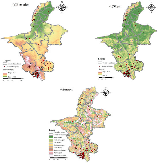 The historical fire points used in this study are the census survey data of Ningxia Hui Autonomous Region, which are from 2000 to 2020, and all of them are confirmed to be historical fire points by county–city–province audit, with 225 points in total, the most in Lunde and Jinyuan counties. The DEM data were obtained from the Center for Resource and Environmental Sciences, Chinese Academy of Sciences (https://www.resdc.cn, accessed on 8 January 2022), and we extracted the slope and slope direction from the DEM, as shown in Figure 2 and Table 2. The areas with high elevation are located in Haiyuan County, Lunde County, Jinyuan County, Xiji County, Panyang County, Concentric County, etc. The districts and counties of Pingluo, Helan, and Jinfeng District are located in the lower elevation districts and counties. Areas with steep slopes are located in the northwestern part of Ningxia Autonomous Region (western part of Helan County, western part of Dawukou District, and western part of Huinong District), Lunde County, Jinyuan County, Xiji County, Pengyang County, etc.