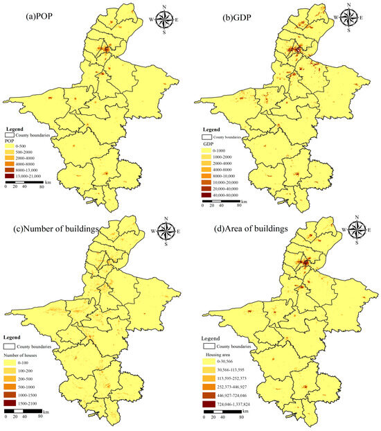 The population grid data (30 arcsec), building grid data (30 arcsec), and GDP data (30 arcsec) were sourced from the Census Office of the Ningxia Hui Autonomous Region. As illustrated in Figure 5, regions characterized by high population density, robust economic activity, expansive building coverage, and a substantial number of buildings exhibit a notable concentration in the Jinfeng District, Xingqing District, Xixia District, Shapotou District, and Yuanzhou District.