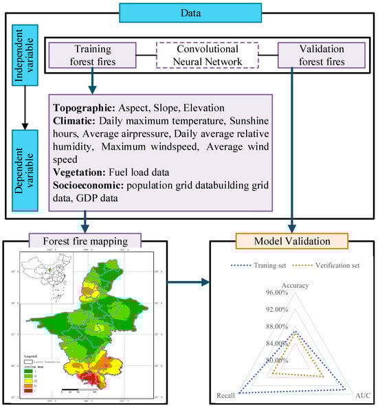 There are various methods for predicting wildfire occurrence, spanning multiple fields. The primary methods include historical data analysis, Geographic Information System (GIS) technology, meteorological data analysis, remote sensing technology, comprehensive risk assessment, and analysis of socioeconomic factors. These approaches help identify potential wildfire occurrence factors and aid in the development of effective fire prevention strategies [8]. A variety of forest fire occurrence prediction methods have been developed at home and abroad, which are mainly summarized as the following three methods: (i) Experiments based on combustion and fire risk prediction based on historical forest fire data and ignition experiments in the study area to determine the threshold range of forest fire driving factors for combustible materials to reach ignition point [9,10]. (ii) Involving a rigorous statistical examination of the correlation between factors contributing to forest fires and actual recorded forest fire events, this study leverages historical forest fire data to predict the potential occurrence of fire incidents within the context of regional environmental conditions. By analyzing the interplay between various triggering factors and fire incidents, the aim is to enhance our understanding of fire risk within the specific regional context and inform decision-making processes [11,12]. (iii) Using machine learning methods to build occurrence prediction models to train and test forest fire datasets to predict occurrence probabilities [8,13]. However, there is a scarcity of research that combines gridded data with deep learning for predicting forest fire occurrences at the provincial level, despite the fact that gridded data can effectively account for spatial heterogeneity and discern variations within grid cells [14,15]. Convolutional Neural Networks show good performance in predictive learning [16]. Compared to the Internet of things [17,18,19] and Integrated systems [20], CNN technology offers significant advantages, particularly its automatic feature extraction capability, which reduces reliance on manually designed, complex feature extractors. This enhances adaptability to diverse data types and intricate patterns. Deep learning CNNs have demonstrated exceptional performance in domains such as image recognition, speech recognition, and natural language processing. CNNs efficiently handle large-scale data, delivering real-time predictions at impressive speeds and excelling in tasks requiring extensive image data processing. At the core of CNNs are their convolutional layers, utilizing convolution operations and a sliding window mechanism to capture local features in input data. The weight-sharing mechanism, employing identical convolutional kernels throughout the entire image, reduces network parameters, contributing to the suitability of CNNs for processing extensive image data. In contrast, Conventional Neural Networks (CNNs) lack a distinct local perception mechanism, connecting each neuron in input and hidden layers with every neuron in the following layer. NNs are more suitable for processing one-dimensional data like text or time series data. CNNs typically feature a lower parameter count, simplifying training processes even with limited datasets [21,22].
