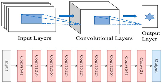 Convolutional Neural Network (CNN) models are one of the most important classical structures in deep learning models [28]. Convolutions applied within a multi-layer feed-forward neural network framework exhibit a network architecture distinguished by employing distinct sets of convolutional kernels in every layer. These kernels serve to extract valuable features from data points with localized significance [29]. CNN kernels represent different receptors that can respond to various features; the activation function simulates the function that only neuroelectric signals above a certain threshold can be transmitted to the next neuron [30]. The process of convolution significantly diminishes the learning intricacy of the network model, resulting in fewer network connections and weight parameters. This attribute simplifies the training process compared to an equivalently sized, fully connected network [31]. A Convolutional Neural Network (CNN) that incorporates local connectivity, weight sharing, downsampling, and dimensionality reduction [30].