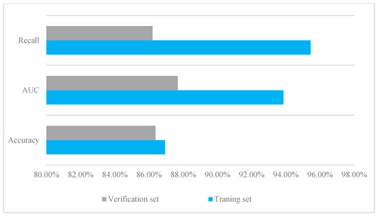 As depicted in Figure 8, our findings indicate strong performance and efficacy for the method outlined in this paper. Specifically, the training set achieved an Accuracy of 86.9%, Recall of 95.5%, and AUC of 93.9%, while the test set yielded an Accuracy of 84.3%, Recall of 86.2%, and AUC of 87.7%, respectively, showing the good performance and effectiveness of the method constructed in this paper. The significance of these results is that our approach demonstrates relatively high levels of accuracy, recall, and AUC on both the training and test datasets. This indicates that our model can effectively identify and predict the risk of forest fires. High accuracy signifies the model’s ability to correctly classify fire events, high recall suggests that the model can capture most of the actual fire events, and a high AUC indicates that the model performs well under different threshold values. This is of paramount importance for forest fire prevention and early warning, as it assists relevant authorities in optimizing resource allocation and implementing control measures. The reasons behind these results lie in our utilization of deep learning CNN technology in conjunction with multiple data sources, enabling us to more accurately capture the complex patterns of fire occurrence. Furthermore, our approach takes into account various factors such as combustibles, GDP, POP, meteorology, and buildings to enhance the model’s predictive performance.