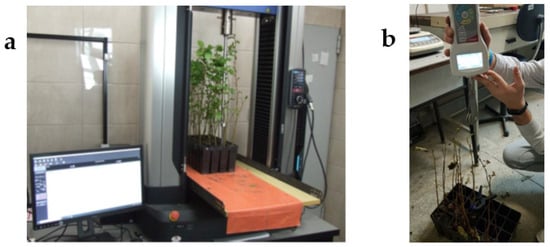 Measurement of the force necessary to pull a seedling out of its container: (a) Shimadzu AGX-V universal testing machine; (b) manual Axis FC 200 dynamometer.