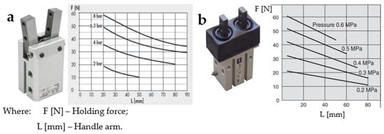 Grippers with their operating characteristics: (a) P7K20 Metal Work angle gripper; (b) SMC MHK2-20D parallel gripper.