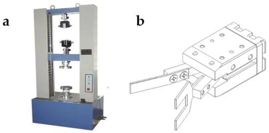 Holding force test stand: (a) universal testing machine, type HT-2402; (b) angle gripper model with gripping tips attached.