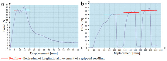 The course of the seedling holding force for the tested types of grippers: (a) angle gripper; (b) parallel gripper.