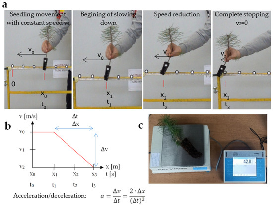 Tests of the acceleration acting on the seedlings: (a) subsequent moments while the seedling movement was slowing down; (b) method of determining acceleration; (c) measurement of the mass loss in the soil lump.
