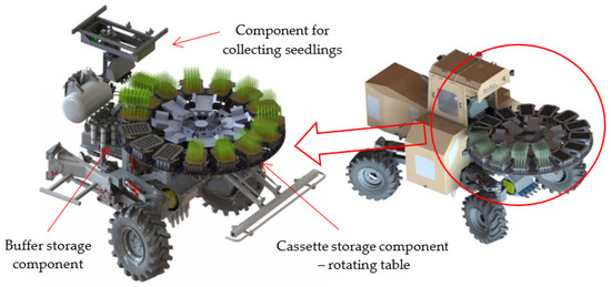 The basic research and work cycle analyses performed allowed for the selection of specific executive elements in the form of ready-made purchased components (actuators, grippers, motors, etc.). This, on the basis of the developed solution concepts and the selection of one of them, enabled the final design of the storage and feeding unit (Figure 8). This unit is located in the front upper part of the vehicle and consists of three main components: a rotating table—a nursery cassette storage unit (Figure 9), a unit for collecting seedlings out of their cassettes and a buffer unit.