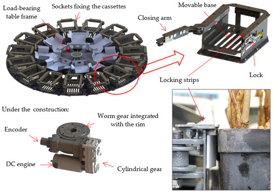 The largest spatial element of the seedling storage and feeding unit is the rotating table, which is simultaneously a storage component and a cassette feeder. Due to the difference in height of the cassettes selected for use in the mobile device, the developed positioning socket is equipped with a movable base so as to be able to position both types of cassettes in the desired place. This element has been designed in such a way that, using sliding guides and appropriately adapted guide paths, the height of the socket base is changed, adapting it to the height of the nursery cassettes. The use of a manual locking system in the form of a closing arm and a lock allows users to easily and quickly remove empty cassettes and replace them with ones filled with seedlings (Figure 10). The upper locking strips support the cassettes to prevent them from being lifted up together with the extracted seedlings. The drive of the rotating table is located underneath in its central part and is composed of a DC motor and two gear types, the cylindrical and the worm gear, whose combined ratio allows for a significant reduction in rotational speed.