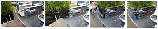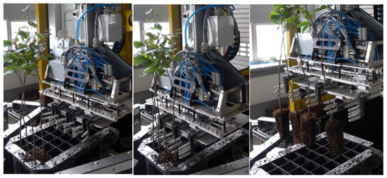 The main function of the seedling collection unit (Figure 11) is to lift their entire row from the nursery cassette fixed in the fixing socket of the rotating table. Next, feed the collected seedlings to a buffer conveyor whose spacing of pipes, i.e., transfer channels, is much larger than a cassette cell. The seedlings grabbed by the gripper arms are lifted to a height that allows the entire root ball to be pulled out above the immobilized cassette. Seedlings pulled out of the cassette by the gripper component are transferred to the channels of the buffer unit using appropriate actuators of the linear motion component (the most important of them is the spindle axis). During this movement on the path between the cassette and the buffer unit, the grippers with the captured seedlings are moved apart to the required distances equal to the spacing of the buffer channels. Appropriately spaced grippers with the seedlings are docked for a moment above the empty buffer channels and when the grip is released, the seedlings fall by gravity into the empty buffer channels. Sequences of the operation of the seedling collection unit are visualized in Figure 12.
