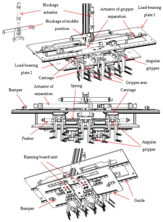 Assume the high efficiency of the seedling collection unit, and therefore very high dynamics of the gripping unit. Also, take into account the limited possibilities of developing this component—rows of grippers as close to each other as possible and grip the seedling as low as possible at the root ball. It was necessary to develop a gripping unit (Figure 13) with the smallest possible weight and dimensions. Such assumptions necessitated the use of the minimum possible number of drive elements in the form of light pneumatic actuators. Due to the need to pull seedlings out of two types of nursery cassettes, the seedling collection unit has the function of automatic conversion to a given cassette type. One type of cassette (type I) contains seedlings of deciduous trees, while the other one (type II) involves coniferous trees, which is related to root system size to cell height. For this reason, the gripper component, consisting of five grippers working in one block, was developed to collect seedlings from cassettes with five rows of cells. To collect seedlings from cassettes with four rows of cells, the rightmost gripper performs idle movement. The operating principle of the gripper component is based on the use of purchased gripper modules to which specially designed gripping arms covered with rubber are attached. Due to the specific dimensions of the grippers and the limited installation area, it was necessary to place the grippers in two rows: three grippers in the upper row and two grippers in the lower row. By appropriately mounting each of the four grippers on the running plate unit, to which two trolleys moving on the guide rails are attached, they can be moved laterally. One of the grippers used in the construction of this assembly (the top central one) is permanently attached to support plate 1 and support plate 2. Connecting the trolleys (the upper and the lower row) of the grippers on the left and right sides, respectively, with each other, using springs and pushers of this unit component, it is possible to move the grippers apart using two pneumatic actuators. Additionally, by using a special blockage activated using an actuator, it is possible to achieve three positions of mutual separation of the grippers (Figure 14).