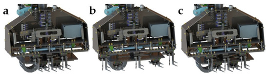 Spacing of grippers depending on the activity being performed: (a) grippers pushed together to pick up seedlings from a cassette with 5 seedlings in a row; (b) extending the grippers for the release of seedlings into the buffer storage; (c) grippers pushed together to pick up seedlings from a cassette with 4 seedlings in a row.