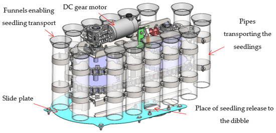 After the seedlings reach the appropriate channels of the buffer unit (Figure 15), due to the forced impulse movement of this carrier, they move along the slide plate toward the inlet to the dibble pipe, over which subsequent seedlings fall by gravity. The movement of the channels attached to chains mounted on wheels coupled to the shafts is carried out using the DC gear motor. The empty buffer channel continues its elliptical loop path to the point of refilling.