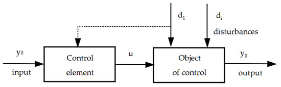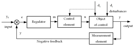 The presented structure has an open control system (Figure 19) operating in accordance with the developed algorithm. This means that the element controlling its operation does not receive any information about the output signal y, but has a specific control goal represented by the set value y0. The set value is the extreme position of specific executive elements (e.g., the actuators extending the grippers, the actuator pulling out seedlings, the actuator lowering the gripping unit, etc.) signaled with binary sensors. In the case of movement of the spindle axis, set values are at specific positions relative to the declared reference position.