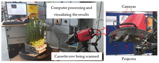 To confirm the validity of the new concept of seedling collection, laboratory tests were carried out (Figure 21) involving the detection of the exact location of seedling root necks using the ATOS II contactless measurement system. The Atos II optical scanner is a device operating on the principle of white light (electromagnetic wave with a wavelength in the range of 380–780 nm). The scanner projects a set of fringes onto the surface of the examined object and observes their distortion on this uneven surface through two cameras placed on both sides of the projector (Figure 22A). The cameras are mounted on a common beam together with the projector, defining the base of the triangle. The vertices of this triangle are constituted by a point on the plane (projected from the projector) and the observation cameras that measure the angle at which a given point is visible (Figure 22B) [24,25]. By analyzing the radiation beams of the waves sent and received (by measuring the delay between sending and receiving the signal) and by using relatively simple geometric relationships, it is possible to determine the coordinates of subsequent points in the Cartesian system (X, Y, Z), as a result of which it is possible to identify a set of such points (the so-called point cloud). The number of scans depends on the complexity and dimensions of the measured detail. The complete cloud contains from a few to several dozen million points, enabling measurement of the surface shape with an accuracy depending on the lenses installed in the scanner. In the final measurement stage, the point cloud is polygonized—it is turned into a proper surface. Individual measured points are connected to each other to form a triangle mesh. This is the so-called STL (Stereolithography)—a standard format for exchanging 3D CAD data in areas of industry related to, among others, rapid prototyping. Thanks to the use of this technology, it is possible to simultaneously scan the entire available surface of the object.