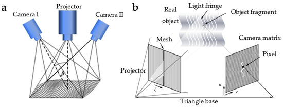 Principle of operation of the ATOS II scanner [25]: (a)—dual camera scanning for improved scanning accuracy; (b)—application of the triangulation principle in 3D scanning.