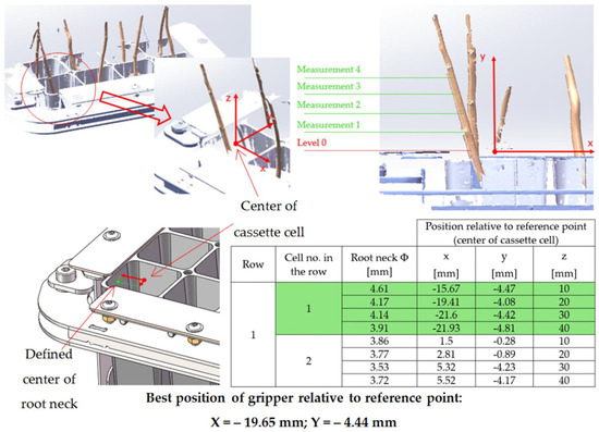 Using the obtained three-dimensional digital image of three subsequent rows of seedlings (Figure 23), further dimensional analyses were carried out, consisting in determination of the diameter and center of the root collar of a given seedling. By comparing the coordinates of the root collar center obtained, averaged from four samples (four heights), with the coordinates of the cell centers of a given cassette (Figure 24), it is possible to determine the set/input values of the position of a specific gripper.