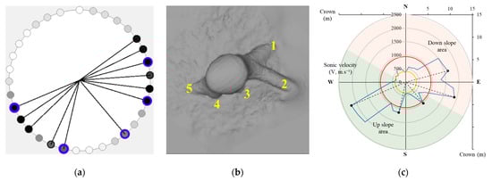 The root detector tool was used to assess the radial distribution of roots, with a particular emphasis on shallow and coarse roots [21]. The process of visualizing the radial root distribution using Microsoft Excel 2019 (Microsoft, Redmond, WA, USA) and Root Detector Evaluation Software 2.4 (Fakopp Enterprise, Agfalva, Hungary) (Figure 3a) was employed. The value of sound wave velocity generated at each point is denoted as “V”. However, in a large tree with various root sizes, root distribution was commonly determined by the main structural roots. It was possible that 2–3 observation points detected a main root due to the size of these roots [28]. Consequently, further analysis is required to differentiate the main root. Sound wave velocity at the main root was estimated based on the following criteria: a value above the overall average, above 400 m·s−1, and a peak value. The “Vroot” denotes the sound wave velocity value that meets these criteria (Figure 3c). The velocity of the 400 m·s−1 value pointed out the average velocity of the soil material.