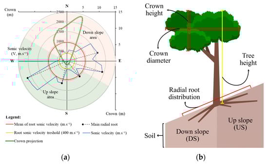 Representative image of root detector analysis on slope condition: (a) Crown projection with a green line and the distribution of the main radial roots based on the peak of sonic velocity (black dash line) and slope position; (b) Crown direction tendency and radial root distribution based on slope position (downslope).