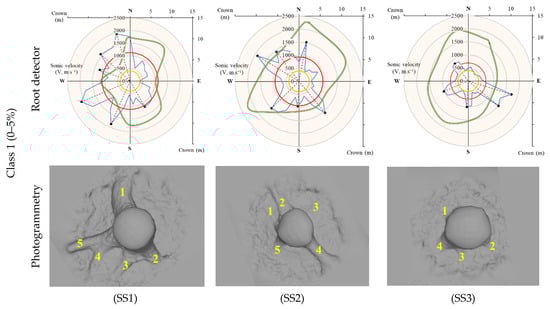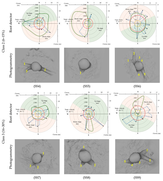 Radial root distribution analysis of rain trees (Samanea saman) using root detector and visual mapping of the root above ground using the photogrammetry method; classified based on the slope category; class 1 (0–5%): (SS1), (SS2), (SS3); class 2 (6–15%): (SS4), (SS5), (SS6); class 3 (16–30%): (SS7), (SS8), (SS9); and class 4 (≥31%): (SS10), (SS11), (SS12). Sonic velocity in main root noted as “Vroot” and shown as a blue line with the peak in a dark point; sonic velocity generally noted as “V” and shown by a blue line; average of V shown in red circle; Vroot threshold (400 m·s−1) in yellow circle.