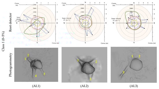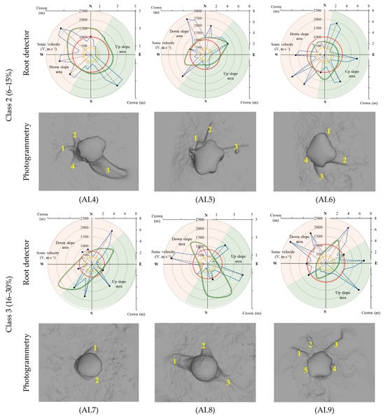 Radial root distribution analysis of damar trees (Agathis loranthifolia) using the root detector and visual mapping of the root above ground using the photogrammetry method; classified based on the slope category; class 1 (0–5%): (AL1), (AL2), (AL3); class 2 (6–15%): (AL4), (AL5), (AL6); class 3 (16–30%): (AL7), (AL8), (AL9); and class 4 (≥31%): (AL10), (AL11), (AL12). Sonic velocity in main root noted as “Vroot” and shown as a blue line with the peak in a dark point; sonic velocity generally noted as “V” and shown by a blue line; average of V shown in red circle; Vroot threshold (400 m·s−1) in yellow circle.