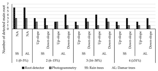 The number of main roots (Σroot) for rain trees and damar trees is based on the class and slope position using the root detector and photogrammetry.