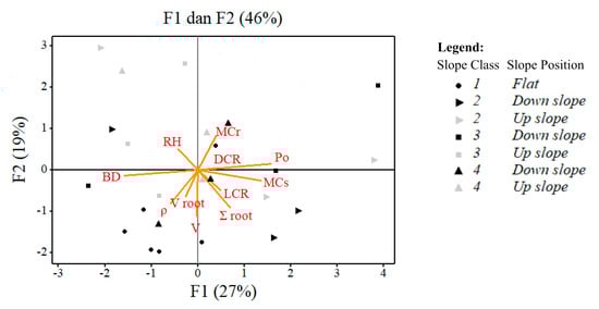 The determination of the relationship grouping among tree morphometric characteristics, physical soil properties, the physical properties of woody root biomass, sound wave velocity, slope class, and slope position on rain and damar trees was carried out using Principal Component Analysis (PCA) with two main factors. This study has a limitation in its sample size. However, the sample size is still large enough to apply PCA in the analysis [37].