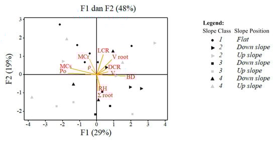 Data processing was carried out using Microsoft Excel 2019 (Microsoft, Redmond, WA, USA). Data were further processed using Minitab 18 software (Minitab, LLC, State College, PA, USA). Several statistical analyses were used, including the comparison analysis of the t-test and nested-analysis of variance (ANOVA) to identify the effect of the slope class and slope position in the soil and root parameters, and Spearman correlation analysis to find a relationship among the used parameters. Since the woody root biomass at different angles measurement in the tree cannot be compared, only one tree was used. The selected tree was located in an area where the slope angle of the land was between the slope class boundaries. The analysis used angular ANOVA to evaluate the impact of soil slope on the sound wave propagation parameter (V) using the conversion of sonic data to angular data. Principal Component Analysis (PCA) was also carried out with testing to evaluate the main parameters of this study.