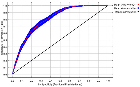 We set the number of repetitions for the MaxEnt model to 15 and constructed 15 potential distribution models with the average taken as the final prediction result. The average AUC value for repeated experiments was 0.804, with a standard deviation of 0.014, which indicates that the predictions were highly reliable (Figure 2).
