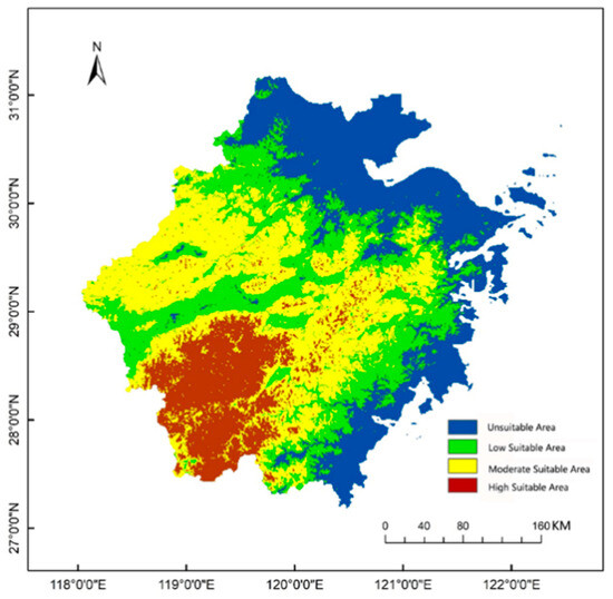 Analysis of suitable areas in Zhejiang Province based on the MaxEnt model.