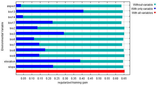The Jackknife test sequentially [4,14] uses and excludes a specific variable to build new models. The differences in Regularized Training Gain, Test Gain, and AUC values between models are compared to measure the importance of bioclimatic variables. The Jackknife test is used to detect the contribution of each environmental factor to the prediction results. Higher Regularized Training Gain values for “only including this variable” indicate greater predictive accuracy and a larger contribution to predicting species distribution. A greater reduction in Regularized Training Gain values for “excluding this variable” compared to “all variables” indicates that the variable contains more unique information and is more important to predict species distribution. The contribution rate, permutation importance values, and Jackknife method were used to evaluate the dominant climate variables that influence species distribution and analyze the importance of bioclimatic variables in restricting the modern geographic distribution pattern of Schima superba. Generally, when the distribution probability value was >0.5, the corresponding ecological factor values were suitable for plant growth.