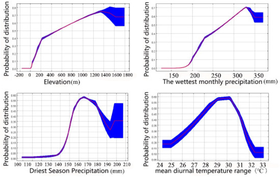 Figure 5 illustrates the response curves of Schima superba distribution to individual environmental variables using a single environmental variable to build the MaxEnt model. The data showed that Schima superba mainly occurs in areas above 500 m in elevation. With the increase in elevation, the probability of Schima superba distribution initially increases and reaches its peak between 1200 and 1400 m. It then decreases with higher elevations. The distribution probability of Schima superba significantly increases with growth during the most humid month with high precipitation (between 300 and 350 mm). However, in areas with higher precipitation during the most humid month, the distribution probability slightly decreases. Likewise, the distribution probability was very low in regions where precipitation was less than 140 mm. Mainly, the distribution probability of Schima superba first rose and then declined with the peak occurring between 160 and 170 mm during the hottest season. The temperature annual range also showed the same variable trend in distribution probability. Here, temperature annual range represents the difference between the highest temperature in the hottest month and the lowest temperature in the coldest month, and our results show the optimal range between 28 and 31 °C (Figure 5).