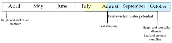 The experiment was set up in April 2020 as a Latin square with four different treatments: WH—regular watering, high dose of fertiliser, DH—induced drought, high dose of fertiliser, WL—regular watering, low dose of fertiliser, and DL—induced drought, low dose of fertiliser. Each treatment had 8 replicates, with 35 randomly selected pots/saplings per replicate (Figure S2). The timeline of measurements and sampling is shown in Figure 1.