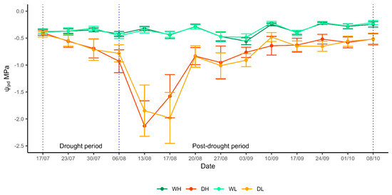 Seasonal pattern of predawn leaf water potential (Ψpd), in the drought and post-drought period for each treatment; regular watering and high dose of fertiliser (WH), regular watering and low dose of fertiliser (WL), induced drought and high dose of fertiliser (DH) and induced drought and low dose of fertiliser (DL). The first vertical dotted line (black) indicates the beginning of the drought, the second vertical dotted line (blue) indicates the time point of rewatering and the beginning of the post-drought period, and the third vertical dotted line (black) indicates the end of the experiment. Dots indicate mean values and vertical bars indicate ± confidence intervals.