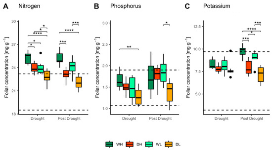 Nitrogen (A), phosphorus (B) and potassium (C) foliar concentrations in the drought and post-drought period, for each treatment; regular watering and high dose of fertiliser (WH), regular watering and low dose of fertiliser (WL), induced drought and high dose of fertiliser (DH) and induced drought and low dose of fertiliser (DL). Levels of significance: * p < 0.05; ** p < 0.01; *** p < 0.001, **** p < 0.0001. Dotted lines represent an optimal range of foliar N, P and K concentrations for common beech according to [53].