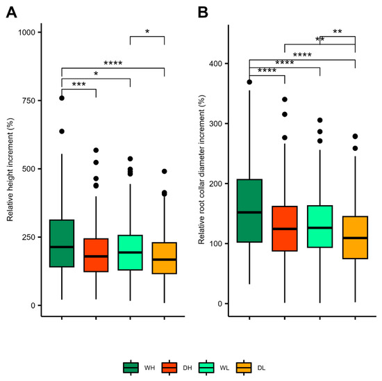 (A) Relative height increment (ih) and (B) relative root collar diameter increment (id) in each treatment; regular watering and high dose of fertiliser (WH), regular watering and low dose of fertiliser (WL), induced drought and high dose of fertiliser (DH) and induced drought and low dose of fertiliser (DL). Levels of significance in differences among treatments are indicated as: * p < 0.05; ** p < 0.01; *** p < 0.001, **** p < 0.0001.