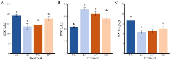 It can be seen from Figure 1 that nitrogen application decreased the SOC content significantly (p < 0.05) under the LN and MN treatments, which were 29.1% and 24.7% lower than that under CK, respectively. However, the reduction under the HN treatment was not significant (p > 0.05). In addition, the SOC content increased with the increase in the nitrogen application gradient (12.62–17.68 g/kg). The SOC content was significantly higher under the HN treatment than under the LN treatment (p < 0.05). Although nitrogen application reduced the SOC content, it resulted in a significant increase in the POC content and a significant decrease in the MAOC content. It can be seen from Figure 1B that the POC content under the LN and MN treatments significantly increased (p < 0.05) from 1.07 g/kg under CK to 1.79 and 1.61 g/kg, respectively, while the increase under the HN treatment was not significant (1.42 g/kg, p > 0.05), and the POC content decreased with the increase in the nitrogen application gradient. The MAOC content was significantly reduced (p < 0.05) by nitrogen application, approximately by 24.7%–35.1%, and it increased with the increase in the nitrogen application gradient.