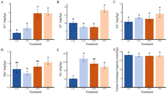 Nitrogen application increased the NO3−-N content in the soil. The MN and HN treatments showed significant increases of 39.5% and 88.6%, respectively, compared to CK (p < 0.05, Table 1). Conversely, nitrogen application decreased the NH4+-N content in the soil, with a significant decrease in the HN treatment, which was 11.29 mg/kg, and a 29.2% reduction compared to CK (p < 0.05, Table 1). The soil TN, pH, and soil C/N were not significantly affected by nitrogen application (p > 0.05, Table 1). Nitrogen application had no significant effect on the CEC and Ca2+ concentration (p > 0.05). However, as the nitrogen gradient increased, the Fe3+ concentration was significantly increased in the MN and HN treatments (p < 0.05), and the Al3+ concentration was significantly increased in the HN treatment (p < 0.05). Nitrogen application did not affect the difference between the Mg2+ concentration and the control (p > 0.05), but the Mg2+ concentration increased with the increasing nitrogen gradient, and the difference between the LN and HN treatments was significant (0.59 and 1.05 mg/kg, p < 0.05). Nitrogen application significantly elevated the concentration of Na+ (p < 0.05), with the highest concentration observed in the LN treatment (135.94 mg/kg). Additionally, a positive correlation was noted between the amount of nitrogen applied and a decrease in the Na+ concentration (Figure 2).