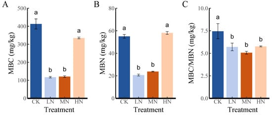 Effects of nitrogen application on soil microbial biomass in Moso bamboo forests. Lowercase letters in each column indicate significant differences (p < 0.05) between different nitrogen application treatments (CK, LN, MN, and HN). (A–C) indicate the response of MBC, MBN and MBC/MBN to nitrogen application, respectively. MBC, microbial carbon; MBN, microbial nitrogen; MBC/MBN, the ratio of microbial carbon to microbial nitrogen.
