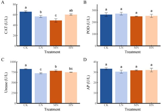 Effect of nitrogen application on enzyme activities in Moso bamboo forests. Lowercase letters in each column indicate significant differences (p < 0.05) between different nitrogen application treatments (CK, LN, MN, and HN). (A–D) indicate the response of CAT, POD, Urease and AP to nitrogen application, respectively. CAT, catalase; POD, peroxidase; AP, acid phosphatase.